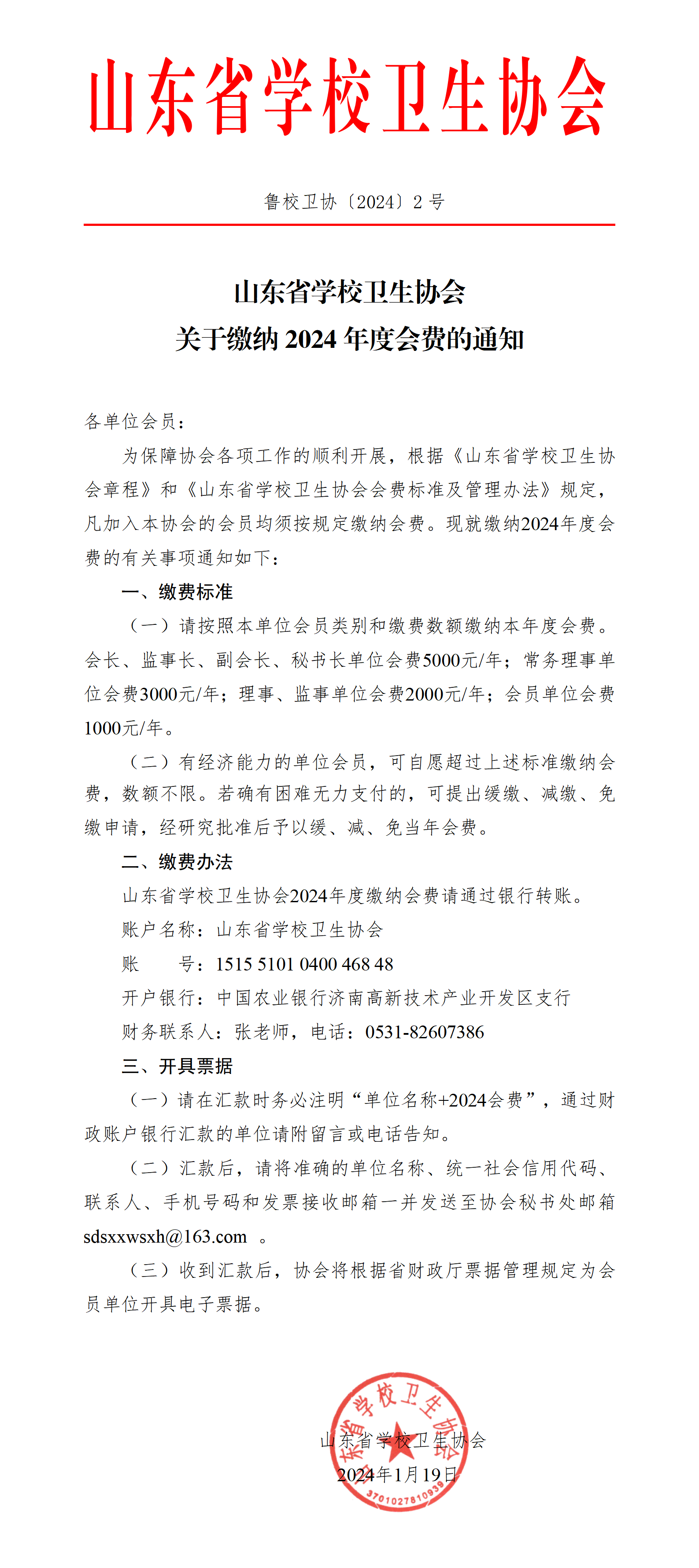 山东省学校卫生协会关于缴纳2024年度会费的通知