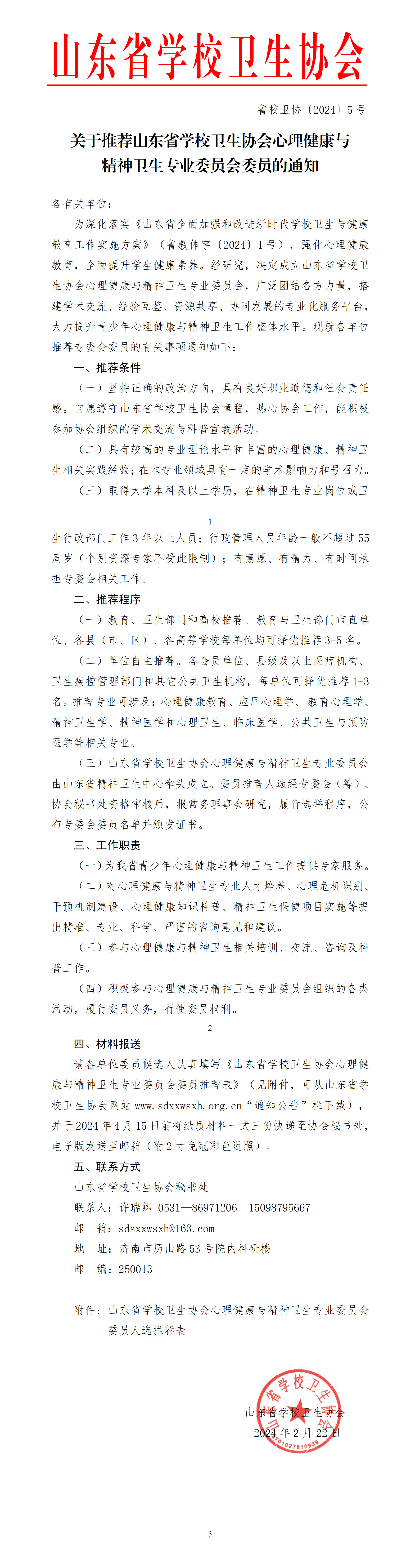 关于推荐山东省学校卫生协会心理健康与精神卫生专业委员会委员的通知